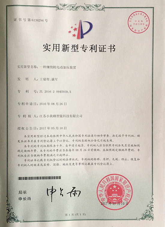 您的位置: 網(wǎng)站首頁 > 榮譽(yù)證書 > 小黃蜂-一種纏繞機(jī)電動加壓裝置